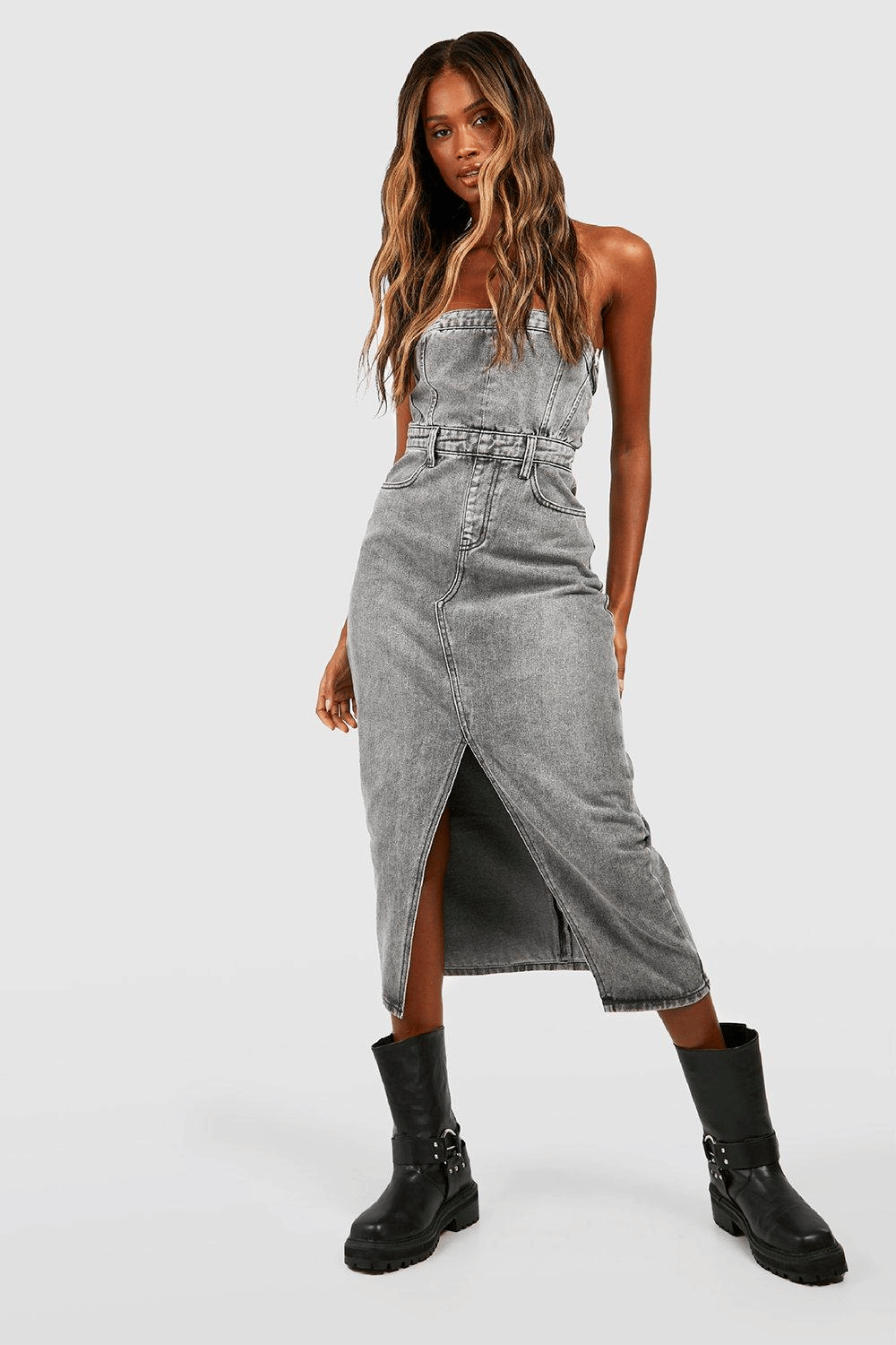 Denim Bandeau Split Front Midi Dress