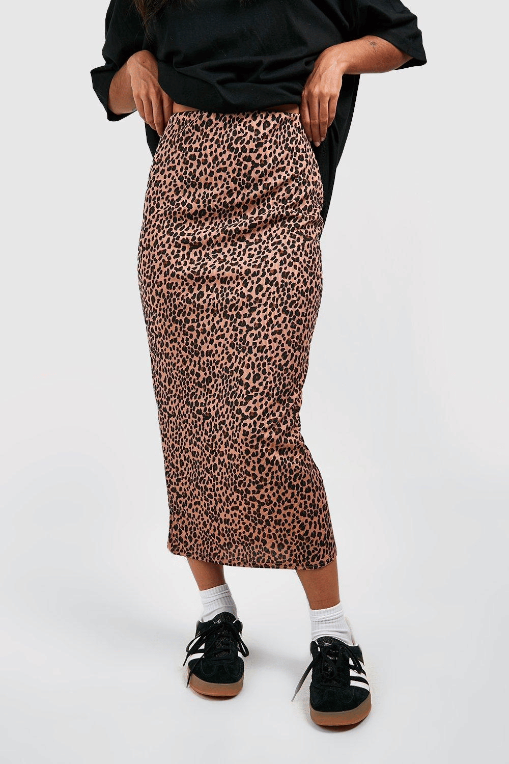 Wanna bring the heat? Look fire from the ground up in this flattering midi skirt. Sitting midway down the calf and skimming your hips for a flattering fit, mid-length skirts are the wardrobe hero you need in your life this season. This on-trend piece is your go-to style for versatility, and is renowned for its complimentary fit. Just pair with trainers for the perfect casual look, or swap out your flats for heels and your Saturday night glam is sorted. Style: Midaxi Skirt Design: Leopard Fabric: Ribbed Jersey Length: Midi 95% Polyester. 5% Elastane.Additional information