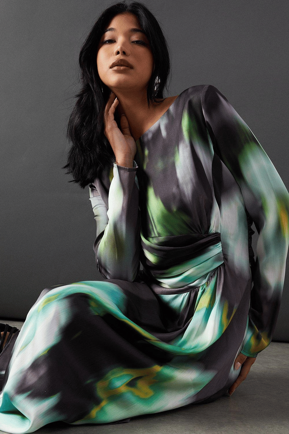 Be the first to review “Printed Satin Knot Front Asymmetric Hem Midi Dress” Cancel reply