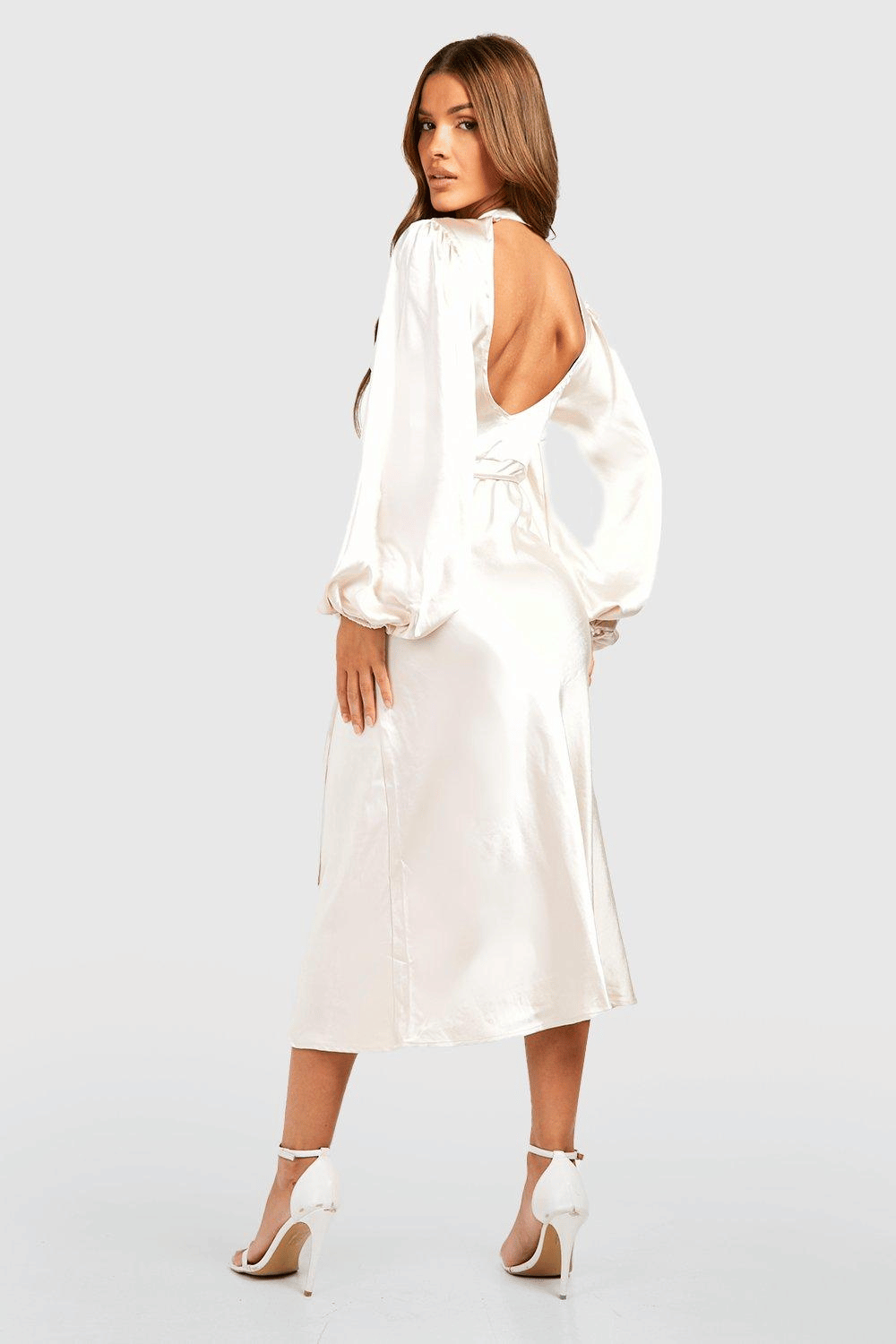 Got the invite but nothing to wear? Stand out from the crowd this season with this wedding guest dress. Designed to flatter every body type and make you feel beautiful as you celebrate a special day, our women's wedding guest dresses will ensure you’re the best-dressed guest in the room. From summer wedding guest dresses to winter wedding outfits perfect for colder days, boohoo has you covered. Just pair with some barely there heels and a matching bag and you’re good to go! Style: Skater Dress Fabric: Satin Length: Midi Neckline: High Neck Sleeve Length: Long Sleeve 100% Polyester.Additional information
